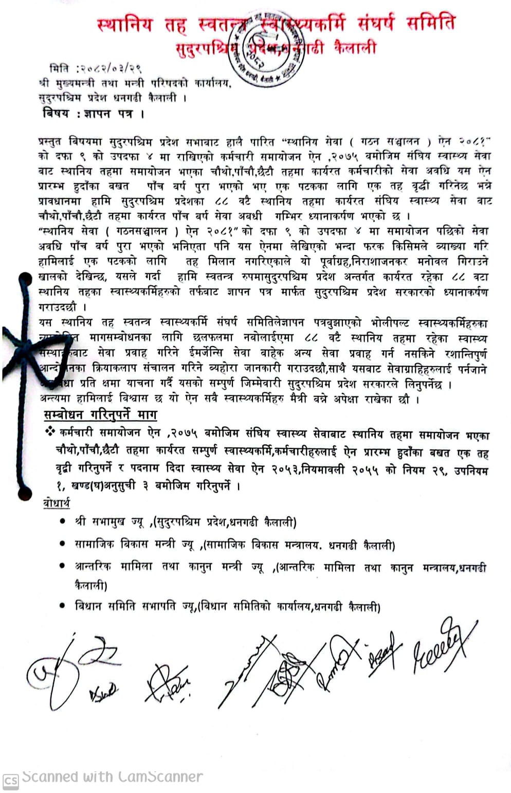 हालै सुदूरपश्चिम प्रदेश सरकारले ल्याएको स्थानीय ऐनमा समायोजन भएका सम्पुर्ण स्वास्थ्यकर्मीहरुले एकपटकका लागि एक तह वृद्धि गरि सबै स्थानीय तहका स्वास्थ्यकर्मीहरुको अधिकार एवं समानताको सुनिश्चिताको माग गर्दै मुख्य मन्त्री शाह समक्ष ज्ञापनपत्र बुझाइएको उनले बताए ।