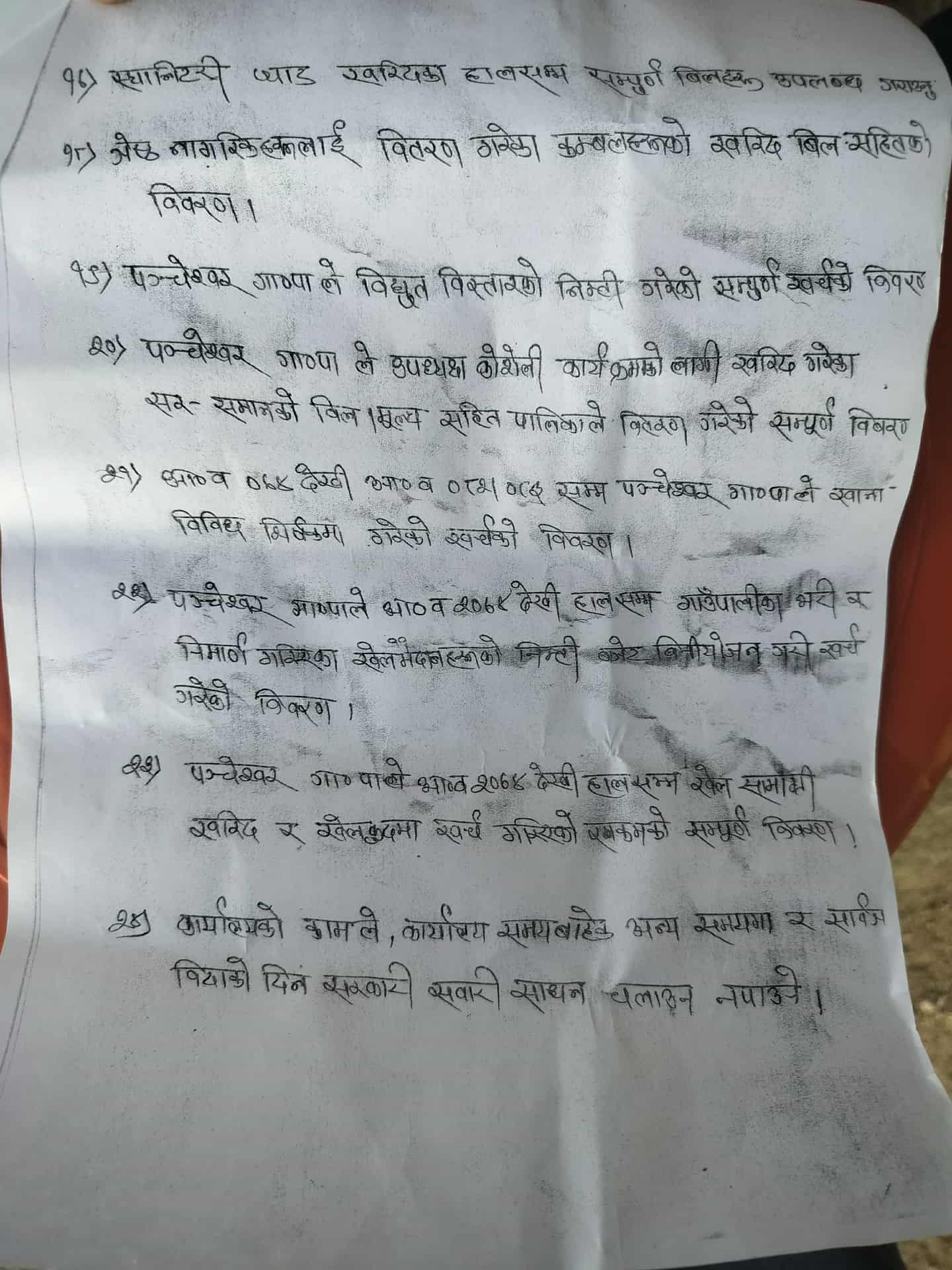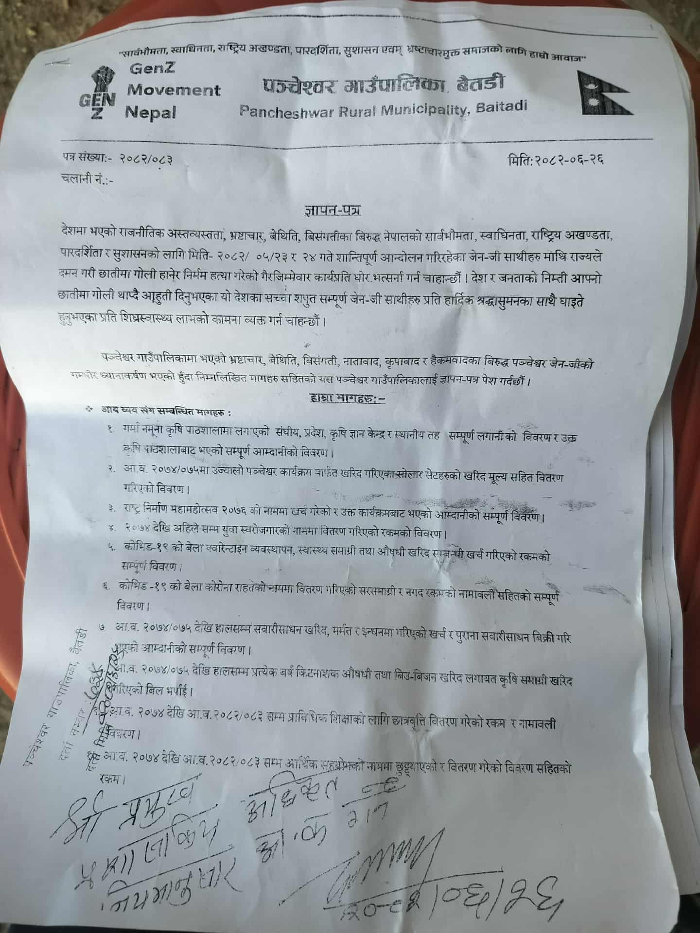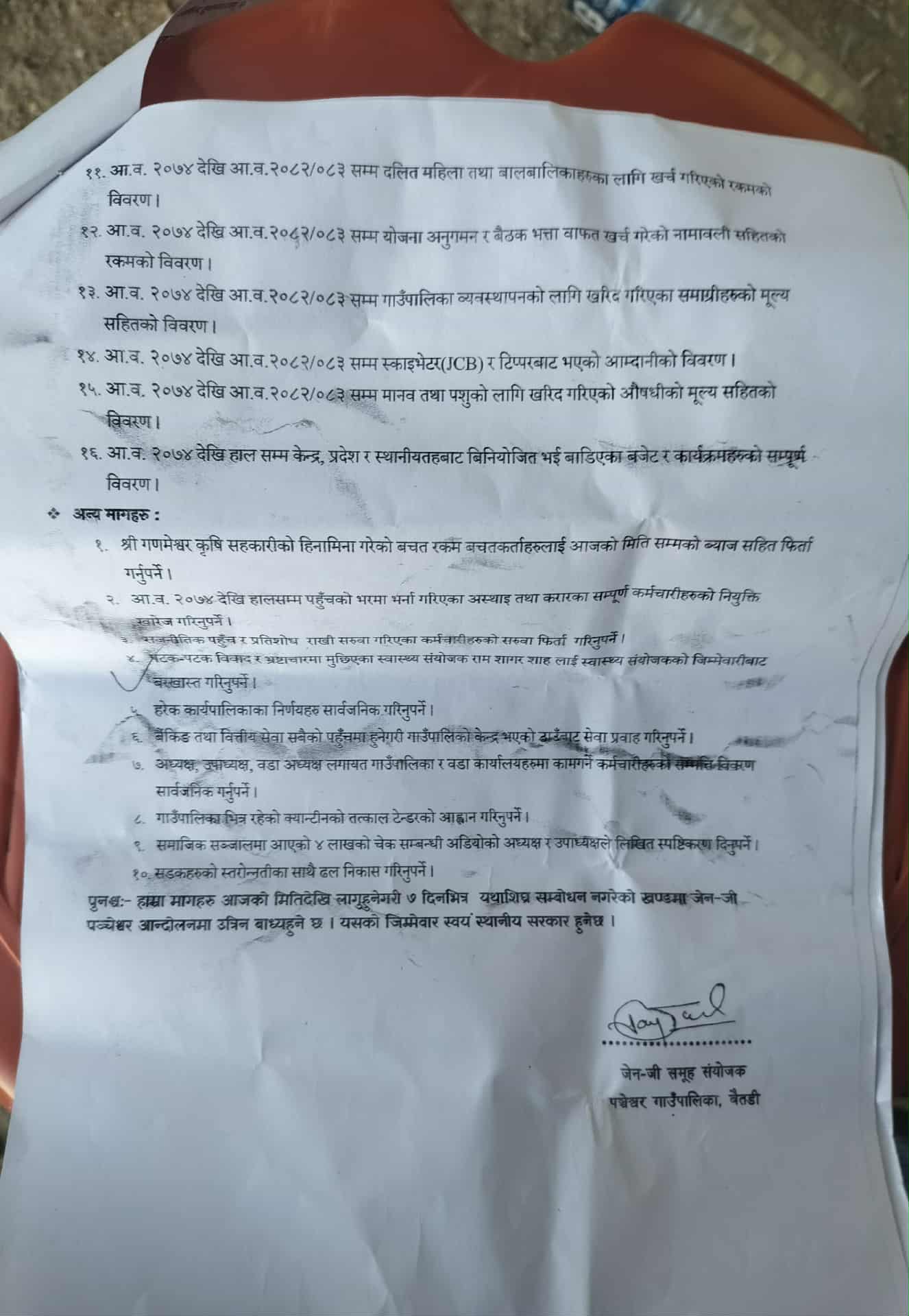 बैतडीको पञ्चेश्वर गाउँपालिकालाई जेनजी समूहले २४ बुदाको विवरण माग गर्दै ज्ञापनपत्र पेस गरेको छ । गाउँपालिका अध्यक्ष गोरख बहादुर चन्दलाई २०७४ सालदेखिका विभिन्न बुदा किटान गर्दै सो सम्बन्धीका विवरण मागगरेको हो ।